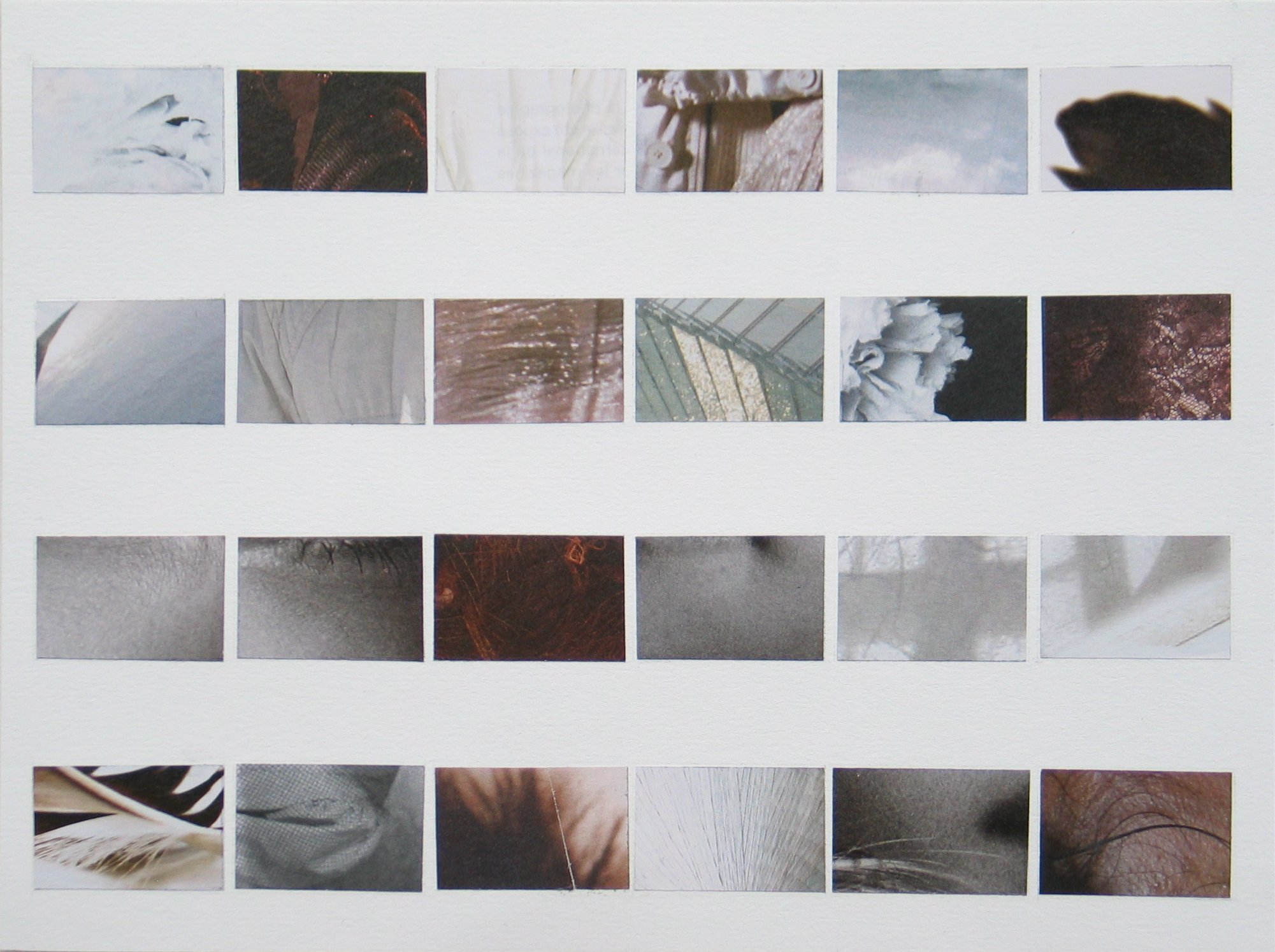 La planche contact du mois : exercice réalisé à l’aide de 24 rectangles de 24 x 36 mm prélevés dans le supplément M #08, supplément au Monde n°20 179 et daté du jeudi 10 décembre 2009 et collés sur une feuille à la manière d’une planche contact.