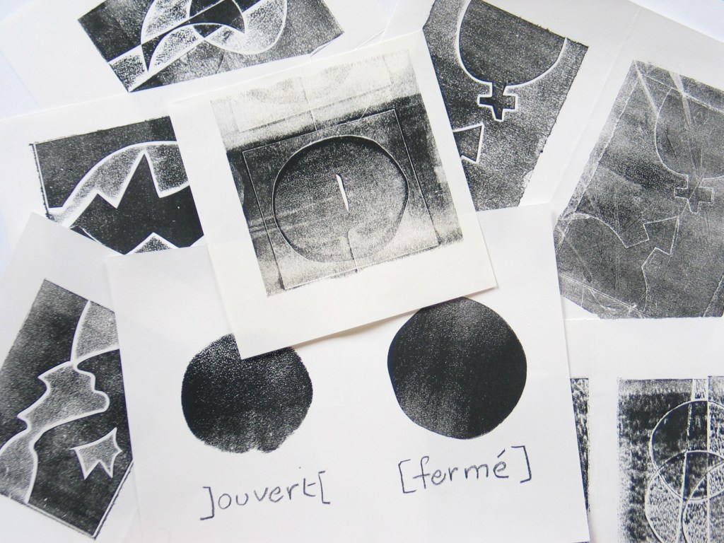 Je pense réaliser un léporello, un livre plié en accordéon, imprimé de gravures un peu dans l’esprit de celles présentées ici, des papyrogravures selon le mot inventé par Anton Prinner. Les formes cernées d’un bord net sont, pour moi, des fermés, les contreformes aux bords flous (sans bord véritablement) sont des ouverts. Je voudrais évoquer la notion d’individu, d’individuation, d’interaction des individus assujettis à une loi commune …