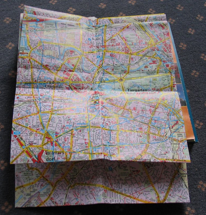 Le problème posé et résolu par Gerhard Falk est le suivant : comment plier une grande feuille, un plan de ville par exemple, de telle sorte qu’elle prenne moins de place, qu’on puisse la ranger facilement, tout en conservant le voisinage des lieux. Avec cette méthode de pliage, la feuille du plan de Berlin qui mesure 90 x 120 cm se range dans un étui de 21 x 11 cm et chaque partie du plan peut se consulter, comme sur la photo ci-dessus, sans que jamais la taille de l’objet dépasse 27 x 20,5 cm.