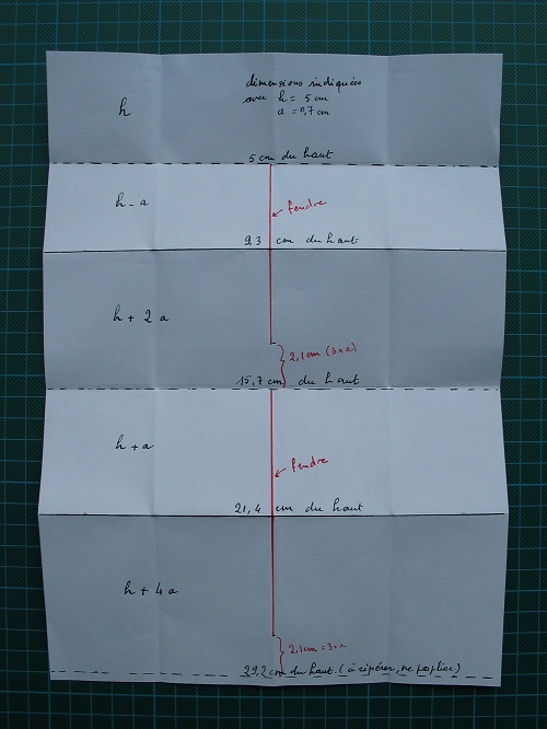 La plier, en accordéon par des plis horizontaux. La taille des plis est croissante du haut vers le bas. Les dimensions indiquées sur cet exemple peuvent être ajustées selon les besoins.