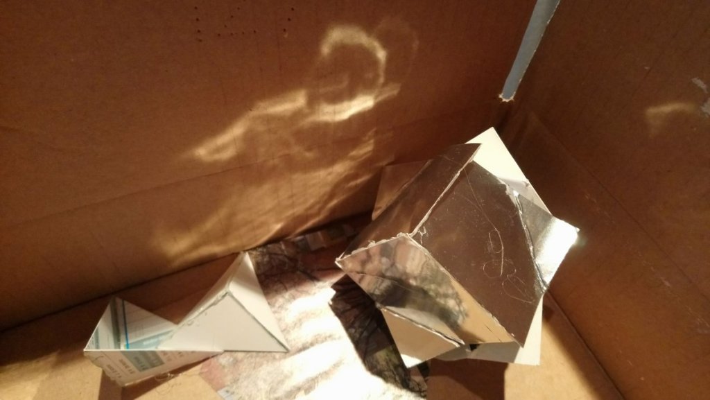 Ce cube en carton-miroir, cabossé, ouvert, était une maquette pour un projet d’exposition. Aujourd’hui le cube envoie sa lumière ; Marie apparaît, Marie Quinquin, l’une de mes arrière-grands-mères.